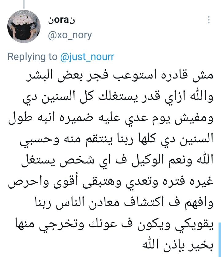 وعلق مدون عبر تويتر، على تغريدة الفتاة: مش قادرة أستوعب تصرفات بعض البشر والله، إزاي قدر يستغلك كل السنين دي، ومفيش يوم عدى عليه ضميره أنِّبُه طول السنين دي كلها، ربنا ينتقم منه، وحسبي الله ونعم الوكيل في أي شخص يستغل غيره، فترة وتعدي، وهتبقى أقوى وأحرص وأفهم في اكتشاف معادن الناس، ربنا يقويكي ويكون في عونك وتخرجي منها بخير بإذن الله.