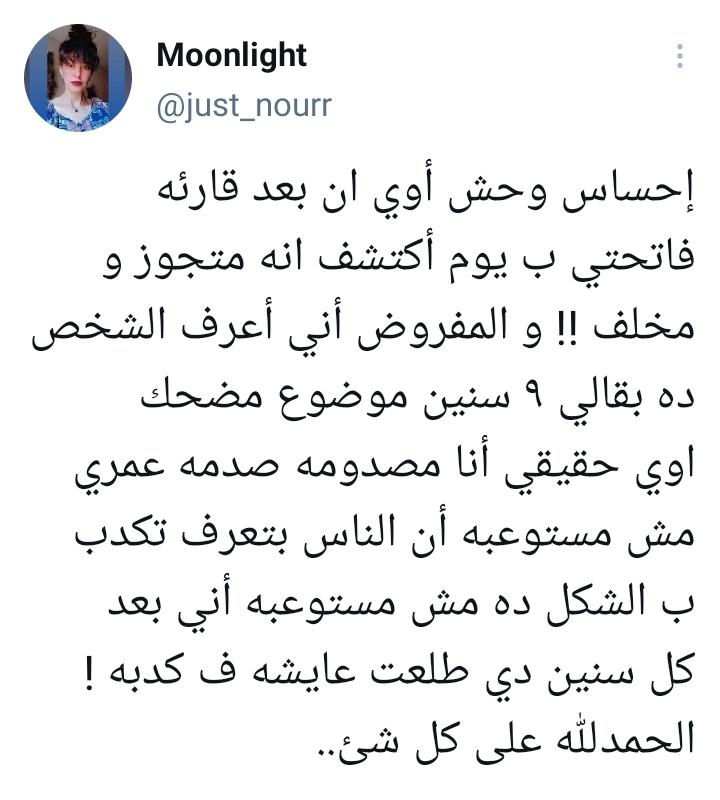 وغردت الفتاة، عبر حسابها بموقع تويتر: إحساس وحش أوي، إن بعد قراءة فاتحتي بيوم؛ أكتشف إنه متجوز ومخلف، والمفروض إني أعرف الشخص ده بقالي 9 سنين، موضوع مضحك أوي، حقيقي أنا مصدومة صدمة عمري.