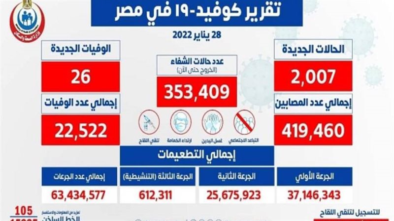 وأوضح الدكتور حسام عبد الغفار المتحدث الرسمي لوزارة الصحة والسكان، أنه تم تسجيل 2007 حالة جديدة ثبتت إيجابية تحاليلها للفيروس ومتحوراته، وذلك ضمن إجراءات الترصد والتقصي والفحوصات اللازمة التي تُجريها الوزارة وفقًا لإرشادات منظمة الصحة العالمية، لافتًا إلى وفاة 26 حالة جديدة.