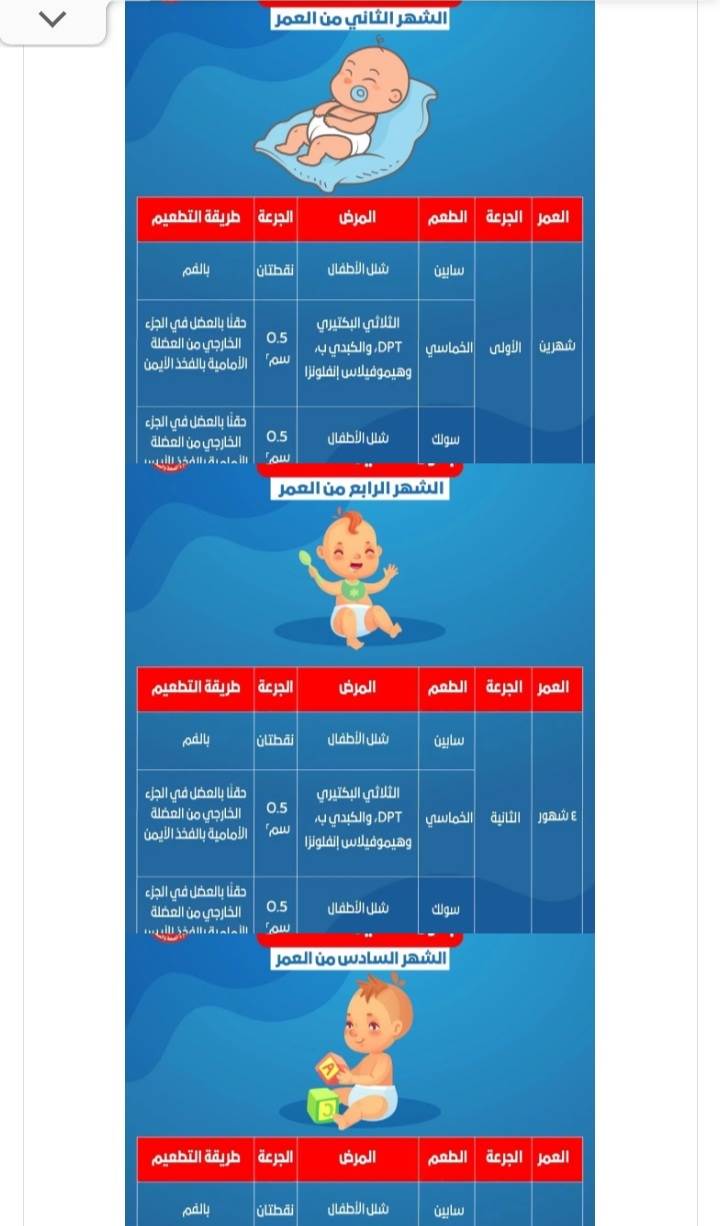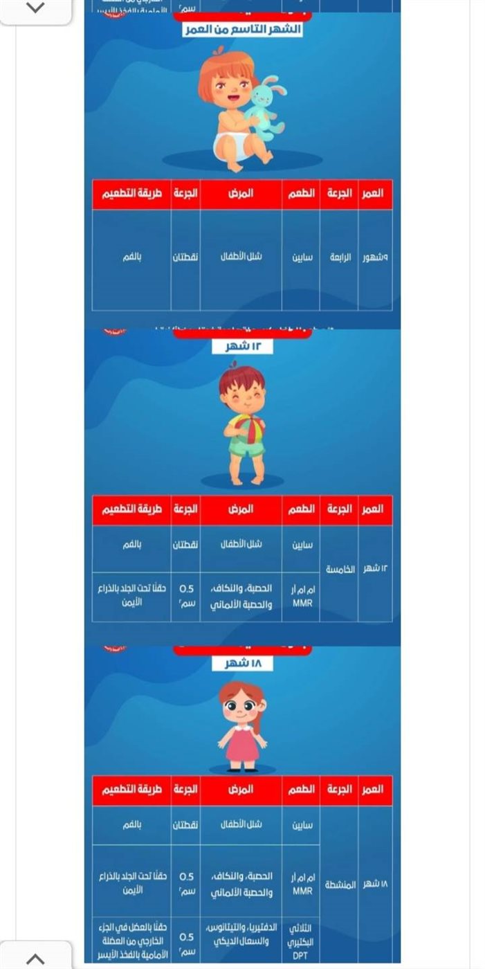 نشرت وزارة الصحة والسكان ، جدول التطعيمات الروتينية ضد مرض شلل الأطفال والامراض الأخرى، من خلال تلقي الجرعة المحددة للفئة العمرية من شهرين حتى عمر عام ونصف.