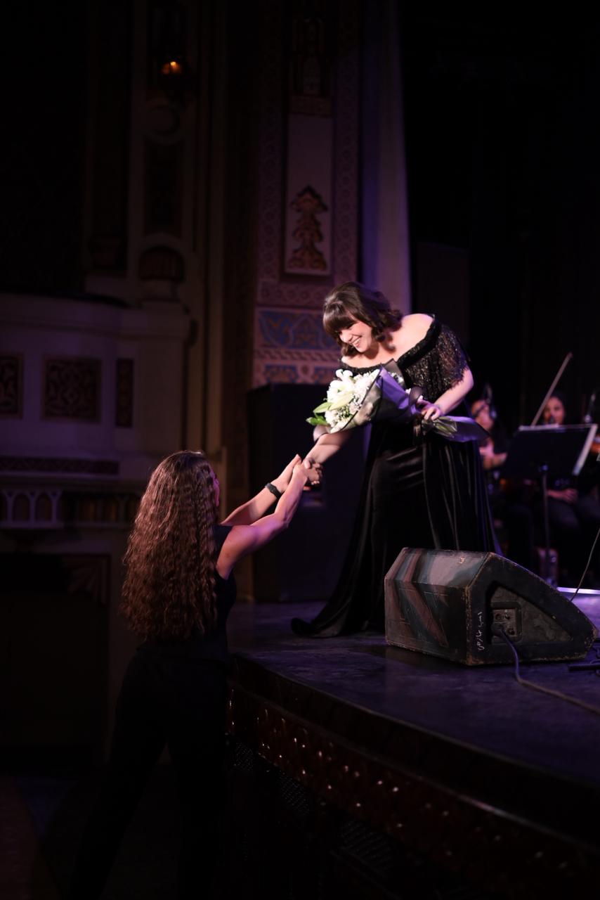 العازفة القديرة الدكتورة مها العربي صاحبتها على آلة القانون، لتكتمل حالة السحر الموسيقي التي سيطرت على أجواء القاعة، وانتهى الأداء بتصفيق مدوٍّ يشبه ما كان يحدث في حفلات أم كلثوم، فيما تقدم الجمهور بباقات الورود إلى الفنانة الشابة تقديرًا لإبداعها.