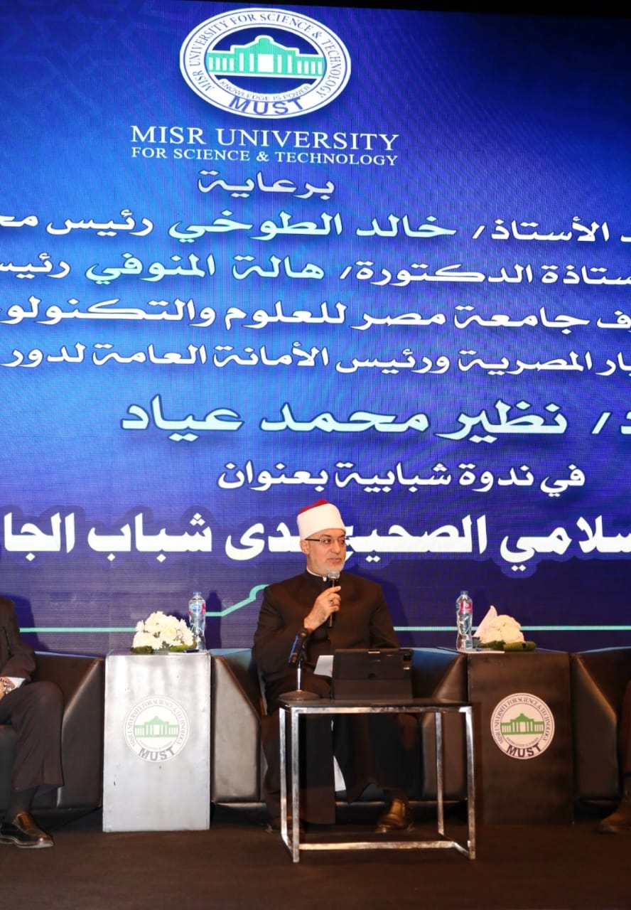 نظمت جامعة مصر للعلوم والتكنولوجيا ندوة توعوية كبرى تحت عنوان "عودة الوعي الإسلامي الرشيد لشباب الجامعات"، بحضور الدكتور نظير محمد عياد، مفتي الجمهورية، ودعم خالد الطوخي، رئيس مجلس أمناء الجامعة، وحرص على الحضور كل من د. هالة المنوفي القائم بأعمال رئيس الجامعة، ود. أنس الفقى نائب رئيس الجامعة لشؤون التعليم والطلاب، ود. كمال درويش عميد الانشطة الطلابية بالجامعة، ولفيف من الطلاب وأعضاء هيئة التدريس.