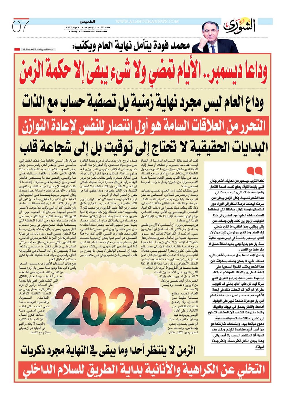 ومع دقات الساعات الأخيرة من ديسمبر، أشعر بأنني لا أود فقط توديع عاما مضى، بل أودع نسخة من نفسي، كانت تحمل بعض الضعف، بعض الخوف، وربما بعض الظلال التي أثقلت قلبي، أفتح بابا جديدا على اتساعه، وأقرر أن أترك خلفي كل ما يعطل روحي عن الحياة: الأنانية، الكراهية، العلاقات المستنزفة، والأحاديث المؤجلة، سأبدأ عامي الجديد بقلب أخف، ووعي أصفى، ونية صادقة لأكون أفضل، لأن الحياة لا تنتظر، والوقت لا يعاد، والمهم في النهاية هو أن نعيش بسلام مع أنفسنا.