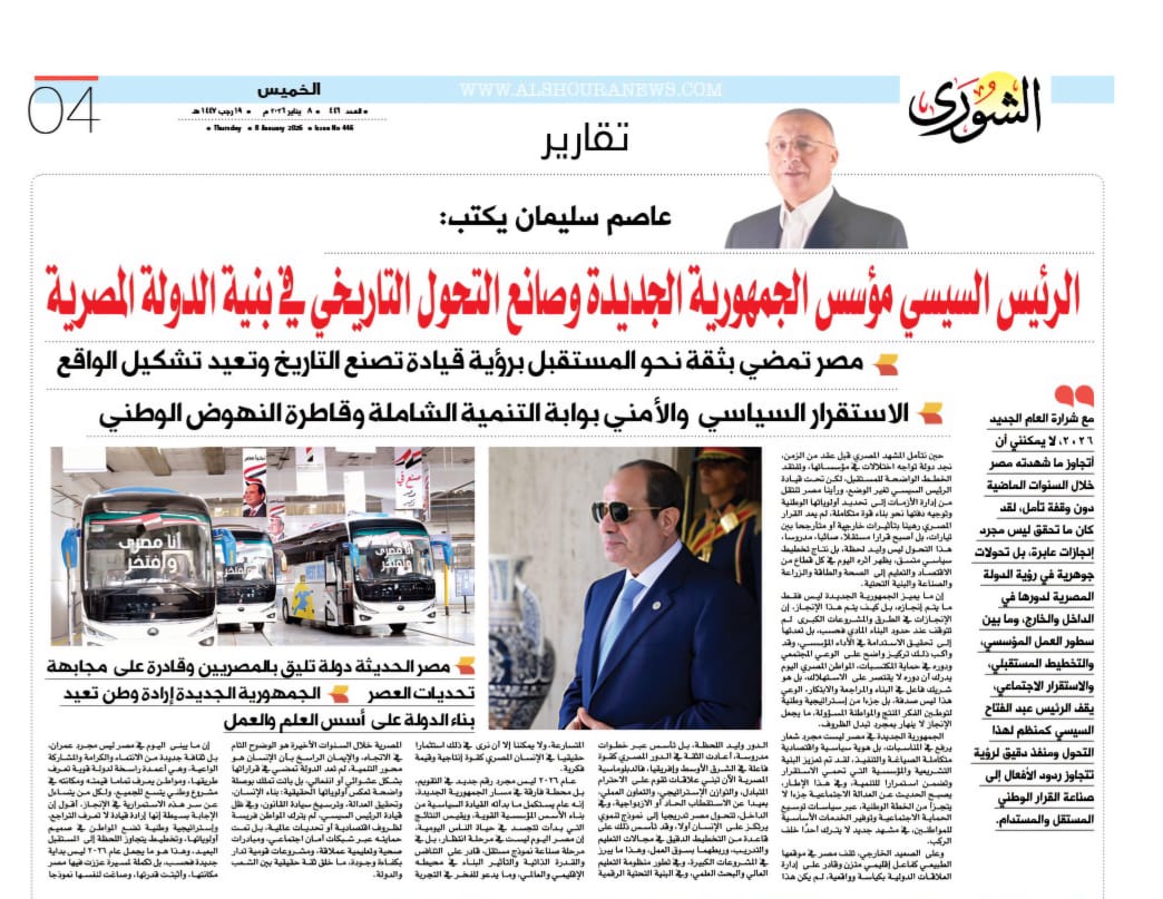 عام 2026 ليس مجرد رقم جديد في التقويم، بل محطة فارقة في مسار الجمهورية الجديدة، إنه عام يستكمل ما بدأته القيادة السياسية من بناء الأسس المؤسسية القوية، ويقيس النتائج التي بدأت تتجسد في حياة الناس اليومية، إن مصر اليوم ليست في مرحلة انتظار، بل في مرحلة صناعة نموذج مستقل، قادر على التنافس والقدرة الذاتية والتأثير البناء في محيطه الإقليمي والعالمي، وما يدعو للفخر في التجربة المصرية خلال السنوات الأخيرة هو الوضوح التام في الاتجاه، والإيمان الراسخ بأن الإنسان هو محور التنمية، لم تعد الدولة تمضي في قراراتها بشكل عشوائي أو انفعالي، بل باتت تملك بوصلة واضحة تعكس أولوياتها الحقيقية: بناء الإنسان، وتحقيق العدالة، وترسيخ سيادة القانون، وفي ظل قيادة الرئيس السيسي، لم يترك المواطن فريسة لظروف اقتصادية أو تحديات عالمية، بل تمت حمايته عبر شبكات أمان اجتماعي، ومبادرات صحية وتعليمية عملاقة، ومشروعات قومية تدار بكفاءة وجودة، ما خلق ثقة حقيقية بين الشعب والدولة.