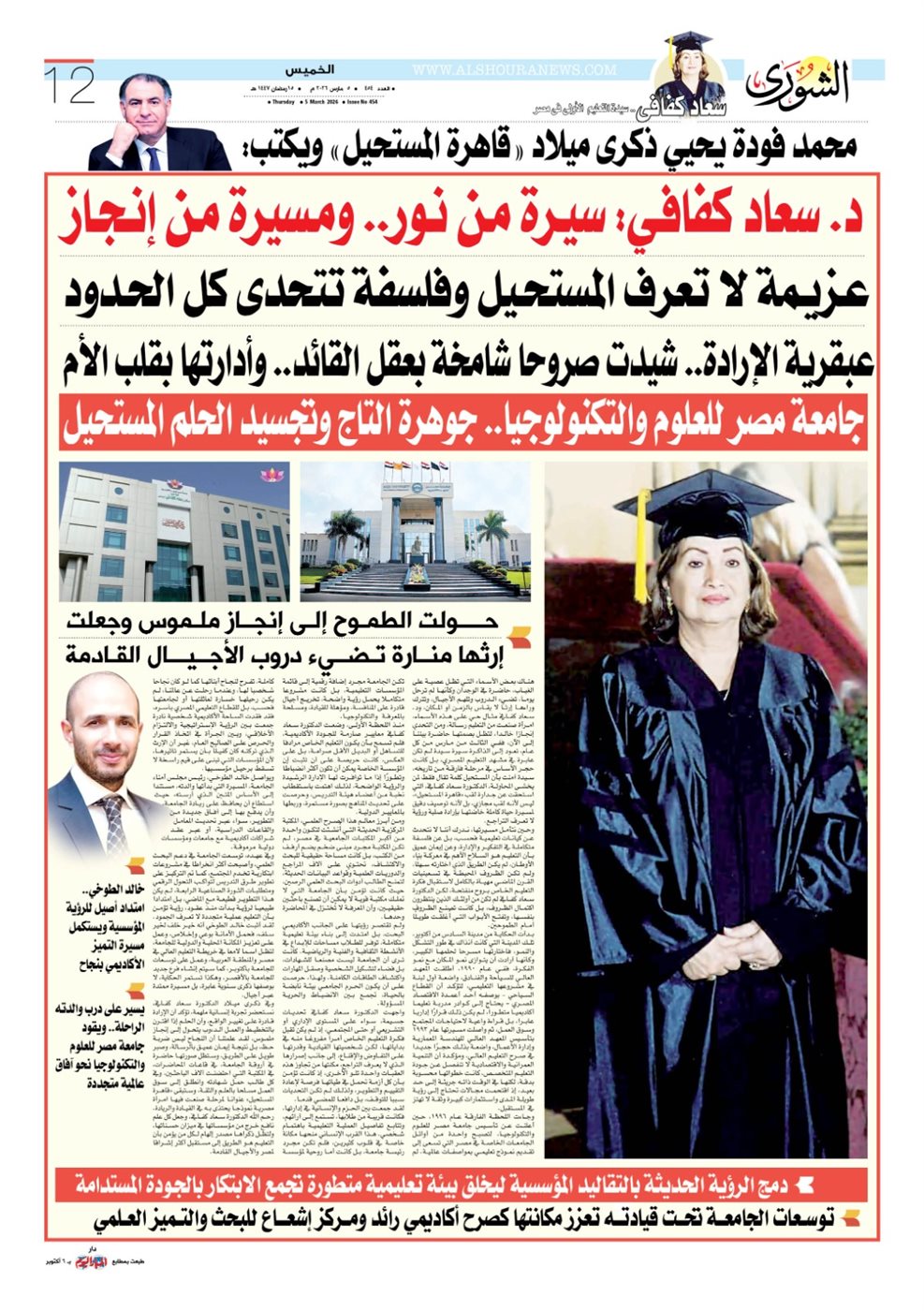 وفي ذكرى ميلاد الدكتورة سعاد كفافي، نستحضر تجربة إنسانية ملهمة، تؤكد أن الإرادة قادرة على تغيير الواقع، وأن الحلم إذا اقترن بالتخطيط والعمل الدءوب يتحول إلى إنجاز ملموس، لقد علمتنا أن النجاح ليس ضربة حظ، بل نتيجة إيمان عميق بالرسالة، وصبر طويل على الطريق، وستظل صورتها حاضرة في أروقة الجامعة، في قاعات المحاضرات، في المكتبة التي احتضنت آلاف الباحثين، وفي كل طالب حمل شهادته وانطلق إلى سوق العمل مسلحا بالعلم والثقة، وستبقى "قاهرة المستحيل" عنوانا لمرحلة صنعت فيها امرأة مصرية نموذجا يحتذى به في القيادة والريادة.