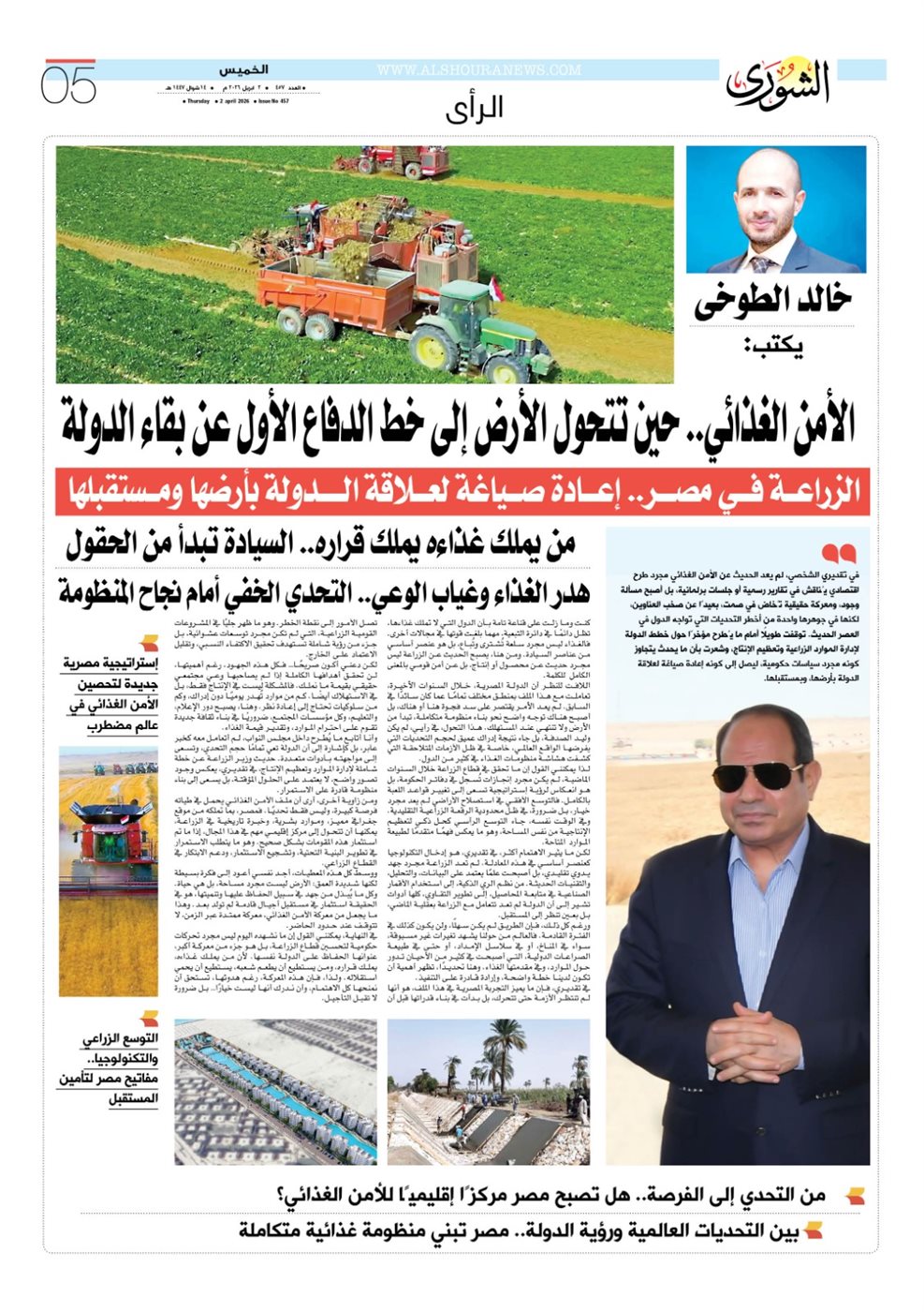كنت وما زلت على قناعة تامة أن الدول التي لا تملك غذاءها، تظل دائمًا في دائرة التبعية، مهما بلغت قوتها في مجالات أخرى. فالغذاء ليس مجرد سلعة تُشترى وتُباع، بل هو عنصر أساسي من عناصر السيادة.