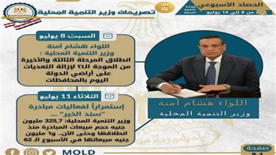 نشرة الحصاد الأسبوعي لرصد أنشطة وزارة التنمية المحلية في الفترة من 8 حتي 14 يوليو الجاري