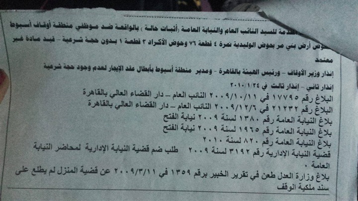 ــ قامت هيئة اوقاف اسيوط بتحصيل ايجار من عام 1962 حتى عام 2009 بدون حجة شرعية أو سند قانوني أو أمر استلام صادر من وزارة اوقاف جهة ملكية الوقف بناحية بني مر بمساحة فدانين وقيراط