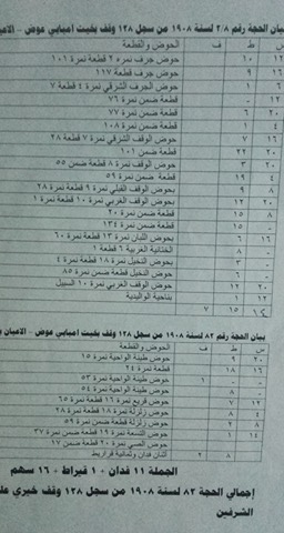 اولا : حجة وقف خيري موقوفه على الحرمين الشريفين رقم الحجه 82 لسنة 1908 من سجل 128 موجود بوزارة الاوقاف ــ ادارة الاوقاف والمحاسبة بالوزارة وكذلك بالوسائق والمعلومات واصل الحجه هي القضية رقم 344 لسنة 2013