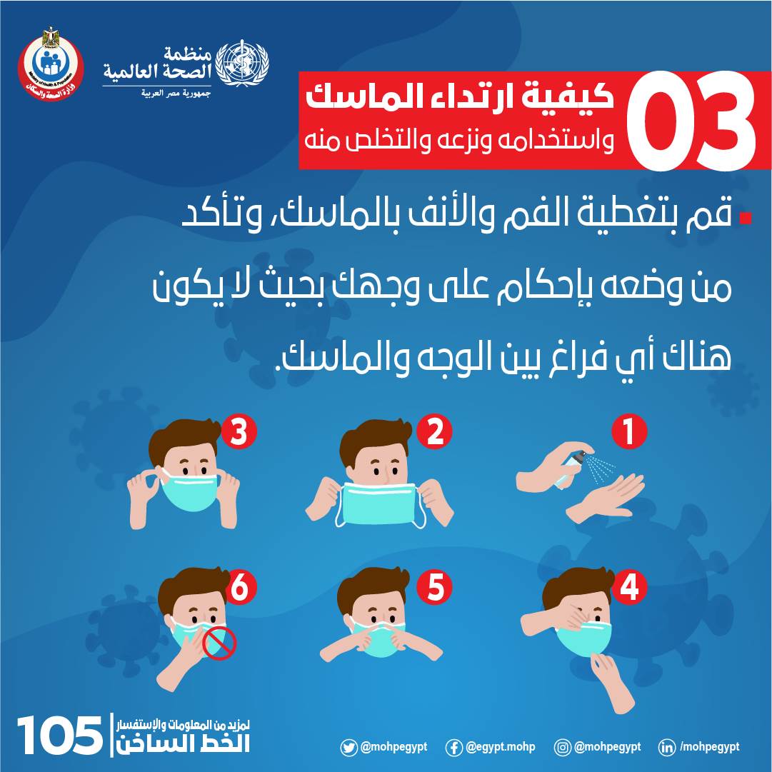عرضت وزارة الصحة والسكان، عبر صفحتها الرسمية بموقع التواصل الاجتماعي "فيس بوك"، مساء اليوم، الطريقة الصحيحة لارتداء الماسك والتخلص منه.