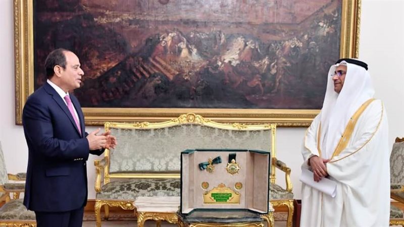 وقد طلب السيد الرئيس نقل تحياته إلى أخيه جلالة الملك حمد بن عيسى، ملك المملكة البحرينية، وكذلك كافة أعضاء البرلمان العربي، متوجهاً سيادته بالتقدير للبرلمان العربي على منحه هذا الوسام الرفيع، بالإضافة إلى مواقفه الداعمة للقضايا التي تمس الأمن القومي المصري، ومعرباً عن الاعتزاز للجهود التي يبذلها البرلمان العربي كمنصة للحوار والديمقراطية، وباعتباره قوة دفع شعبية لمنظومة العمل العربي وشريكاً فاعلاً في خدمة المصالح العليا للأمة العربية وتوثيق الروابط بين شعوبها، مع التأكيد في هذا الإطار على دعم مصر لجهود البرلمان العربي لتحقيق الأهداف المنوطة به، والتطلع لبحث آفاق تدعيم التعاون مع البرلمان العربي لخدمة القضايا العربية المشتركة. من جانبه؛ أعرب السيد العسومي عن تشرفه بقاء السيد الرئيس، مثمناً دور مصر بقيادة سيادته في صون الأمن القومي العربي، فضلاً عن دفع العمل العربي المشترك على شتى الأصعدة، بما فيها البرلمان العربي، وذلك على خلفية الخبرة والتجربة البرلمانية الرائدة لمصر، بالإضافة إلى استضافة مصر للمقر المؤقت لاجتماعات البرلمان العربي، والذي يعكس مدى الإيمان بدوره الفعال باعتباره إحدى الآليات العربية الأساسية للتواصل مع الشعوب واتخاذ مواقف فعالة في سبيل صون مصالح الدول العربية.