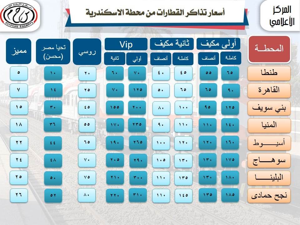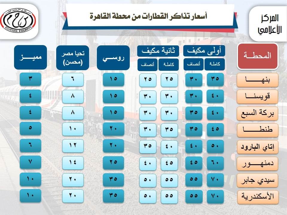 السكة الحديد تنشر أسعار تذاكر قطاراتها المكيفة والعادية.. وتنفى الزيادة