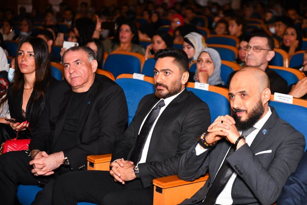 وكرم خالد الطوخى رئيس مجلس الأمناء، النجم تامر حسنى تكريما رسميا بمنحه "درع الجامعة"، لكونه اهم فنان مؤثر حالياً محليا ودوليا في الشباب المصري و العربي ،ولكونه نجما من طراز خاص، ويعد سفيرا للانسانية، كما أنه بالأرقام أيقونة فنية حقيقية وركيزة أساسية من ركائز القوى الناعمة فى مصر، ويمثل طاقة فنية متفجرة ليس فى مجال واحد فقط بل فى مجالات متعددة وجميعها حقق فيها ناجحا ساحقا و كسر جميع الأرقام السابقه لأي نجم على مر العصور و حقق ارقاماً غير مسبوقه في عالم السينما و الغناء معاً سواء كمؤلف افلام أو شاعر غنائي، أو ملحن، أو مطرب، أو ممثل، أو مخرج، أو منتج، أو ممثل أو مطرب، كل هذه المجالات اقتحمها ببراعة واحترافية وحقق فيها نجاحا عبقريا جعل ادارة بيج ابل اوورد العالميه تهديه درع اسطورة القرن و هو العربي الوحيد المعترف به في هوليوود بالبصمه الأسمنتيه ضمن ٢٥٠ فنان عالمي على مر العصور و حاصل على شهادتين من جينيس ريكورد العالميه للأرقام القياسيه