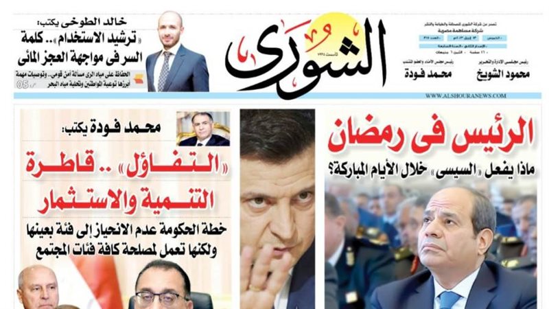 تنشر جريدة "الشورى" في عددها الورقى الصادر اليوم الاربعاء 12- 4- 2023 تفاصيل العديد من القضايا، والملفات المطروحة على الساحة ،أهمها: « الرئيس فى رمضان ».. ماذا يفـعـل «السـيسى» خلال الأيام المباركة؟ ما سر "اجتماعات الاتحادية" مع مدبولى ورجال الحكومة؟.. ولماذا ذهب للإفطار مع رجال القوات المسلحة والشرطة؟