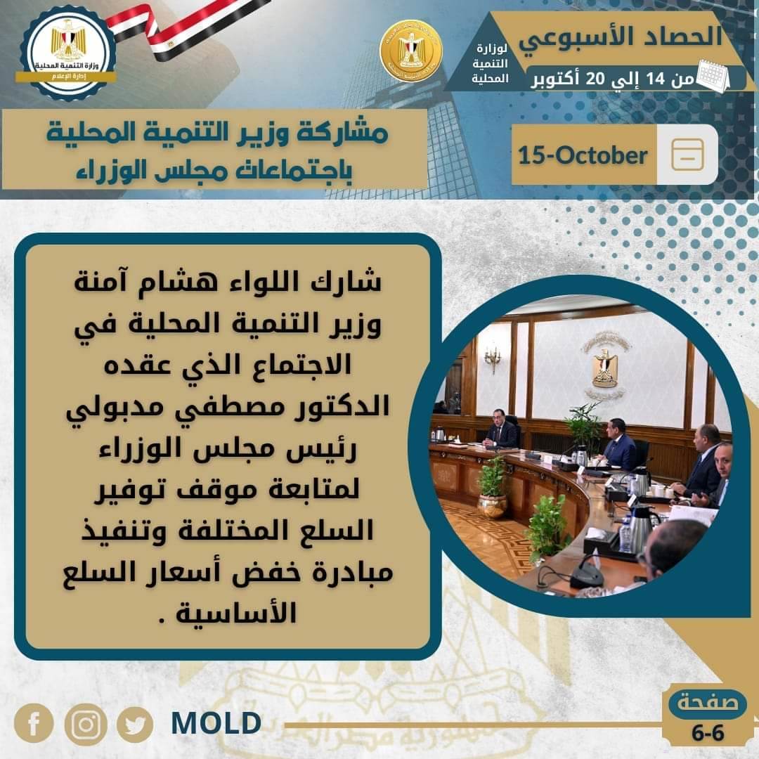 *الأحد 15 أكتوبر* شارك اللواء هشام آمنة وزير التنمية المحلية في الاجتماع الذي عقده الدكتور مصطفي مدبولي رئيس مجلس الوزراء لمتابعة موقف توفير السلع المختلفة وتنفيذ مبادرة خفض أسعار السلع الأساسية .