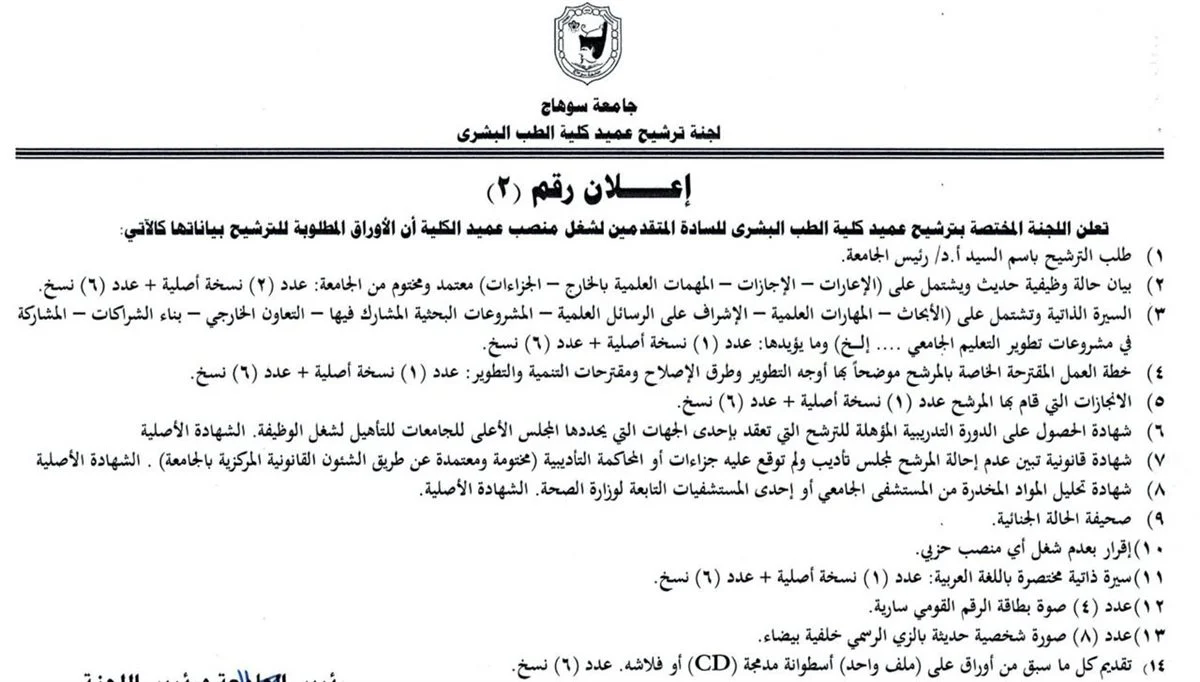 جامعة سوهاج تعلن فتح باب الترشح لمنصب عميد كلية الطب البشري