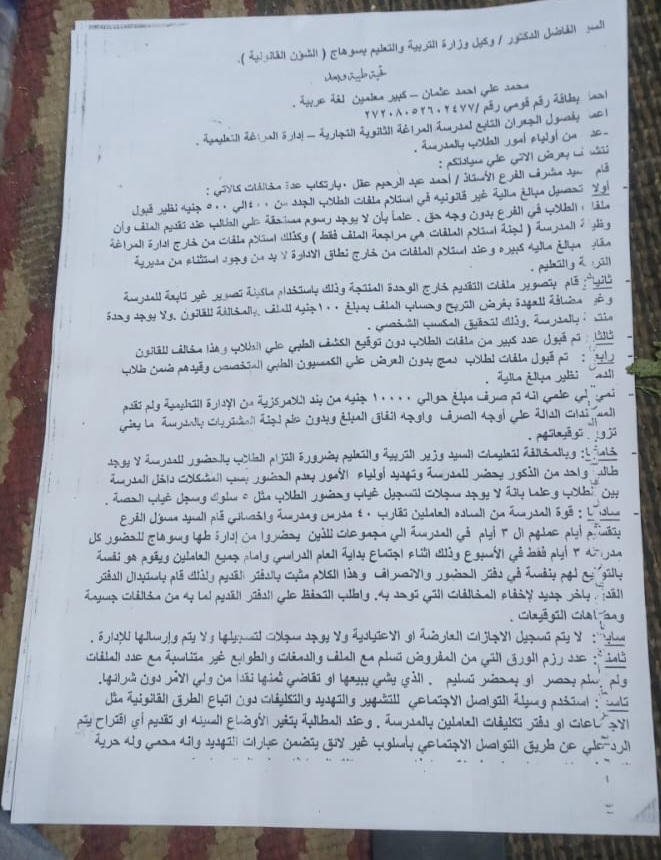 انها حقا كارثة بكل المقاييس تستوجب تدخلا عاجلا وفوريا من كل الاجهزة المعنية، والأمر نضعه برمته امام رئيس مجلس الوزراء ووزير التربية والتعليم ومحافظ سوهاج ومدير تعليم سوهاج، ومن جانبنا نضع كل ما توصلنا اليه من معلومات ومستندات امام الجهات الرقابية المعنية بالأمر لكشف الحقيقة ومعاقبة المتورطين ومحاسبة المقصرين في هذه الجريمة التي نالت من مكانة التعليم وسيادة القانون.