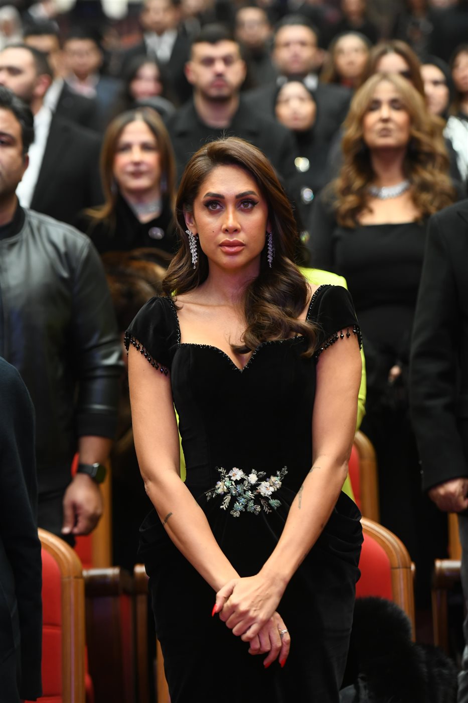 وحضرت إنجي كيوان حفل التكريم بإطلالة راقية خطفت الأنظار، جمعت بين البساطة والأناقة، ما عكس ذوقها الرفيع وحضورها اللافت، حيث ظهرت بإطلالة أنيقة وساحرة على السجادة الحمراء، وتألقت بفستان مخملي أسود بقصة كلاسيكية راقية، زينتها بتفصيلة جذابة عند الخصر أضفت لمسة من الفخامة، واكتملت الإطلالة بأقراط لامعة وتسريحة شعر منسدل بموجات ناعمة، لتجسد صورة للأناقة الهادئة والجاذبية الراقية التي تخطف الأنظار.