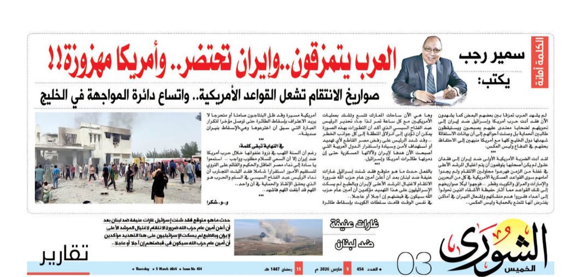 لم يشهد العرب تمزقا بين بعضهم البعض كما يشهدون الآن فقد أدت حرب أمريكا وإسرائيل ضد إيران إلى تحويلهم لضحايا معتدى عليهم يصبحون ويستيقظون طالبين الحماية بل وصلت أحوالهم إلى أن بيانات الاستغاثة شهدتها دول الخليج كلها مع أمريكا منبهين إلى الاحتفاظ بحقهم في الدفاع وليس العكس.